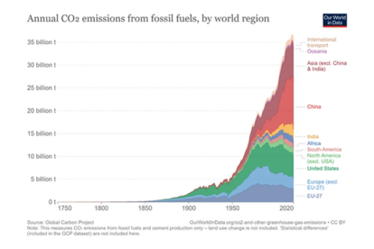 Annual CO2 emissions from fossil fuels, by world region