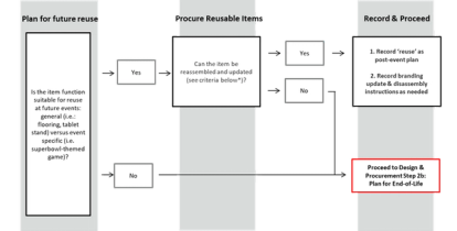 Then, these principles are embedded and direction mapped to each stage of the experiential asset life cycle. The existing responsibilities of each function in that stage are described, with plain language definitions of key terms, step-by-step procedures and decision trees, and criteria for application of the principles that account for potential barriers. For example, one barrier to reuse identified in the review of previously created assets is that branding is frequently updated; items with outdated branding becomes unusable and destined for the waste stream unless the branded elements can be easily updated. So, the design stage now includes planning for reuse or recycling at end of life, and when reuse is planned updatable branding is included in the design criteria.