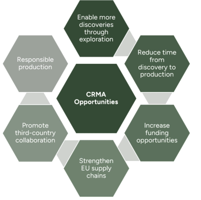 The main processes to achieve the targets of the CRMA are through streamlining development and permitting of ‘Strategic Projects’ (SPs) which incorporate development of national-scale exploration programmes, research and development on circularity of materials and recycling, promoting financing, monitoring and mitigating risks, promoting sustainable production, and promoting collaboration and partnerships.