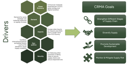 As part of the European Green Deal, the European Commission (EC) has agreed on new legislation referred to as the Critical Raw Materials Act (CRMA) [1] to strengthen production, processing, and recycling of strategic raw materials in Europe and to diversify supply chains. It was agreed to in April 2024 by the European Council and European Parliament and will enter into force on the 23rd of May 2024.