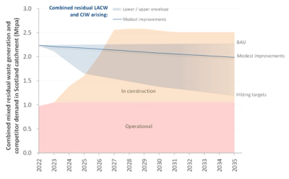 Scotland’s current infrastructure capacity gap is forecast to close by 2027 - 2028, as new EfW plants currently under construction, and scheduled for completion become operational during the period to 2027, with an EfW capacity surplus likely from 2028 onwards.