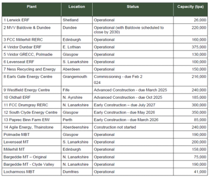 Table excludes the existing three Renewi MBT plants in Argyll & Bute (combined total throughput c.15kta); these are reported to be scheduled to close by 2026.