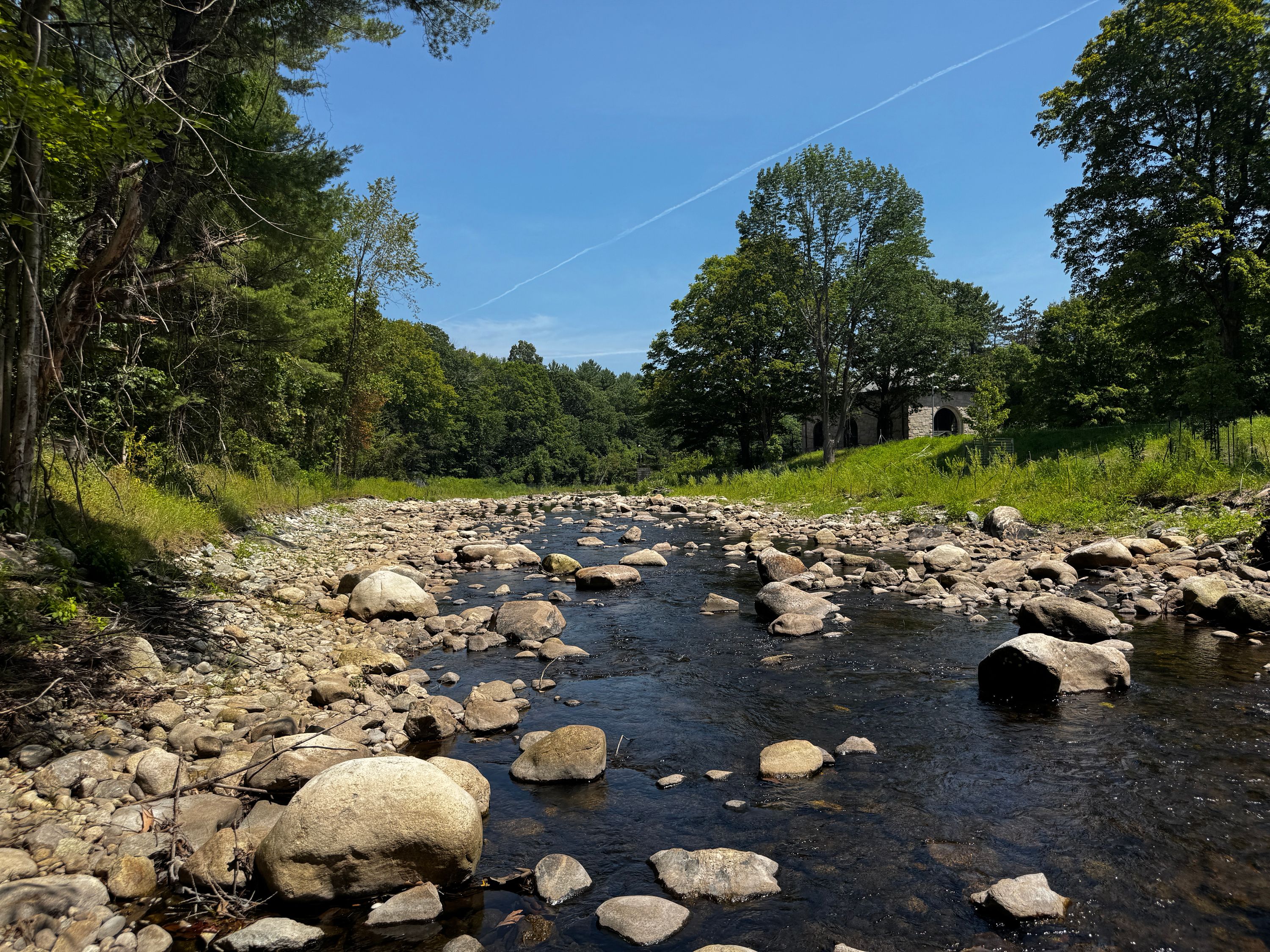 The earthen embankment dam, which was 250 feet long, 18 feet high, with a concrete and stone spillway spanning the river, was constructed in 1905 to support the creation of the Wachusett Reservoir. The semicircular dam was part of a complex system of reservoirs and aqueducts built to supply the Greater Boston area with potable water. Rather than impoundment of the river, the original purpose of the dam was to slow the current and reduce erosion of the riverbed upstream, helping to protect the reservoir’s water quality.