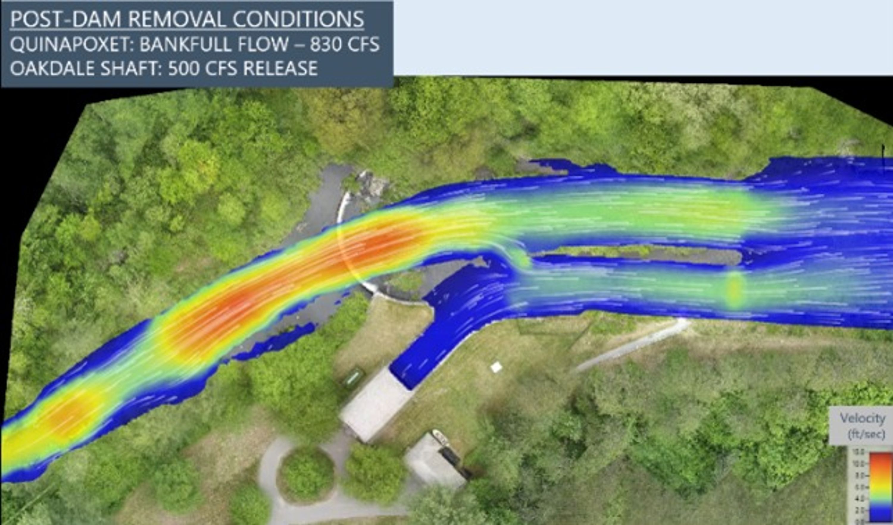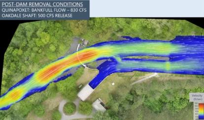 Advanced 2d Hydraulic Modeling – Two-dimensional hydrodynamic modeling was used to evaluate the interaction between various flood flows in the Quinapoxet River, various outflows from the hydropower station, and various water levels in the reservoir to ensure the river would remain stable, hydropower would remain unaffected, and fish passage would be allowed in the restored channel.